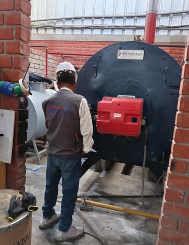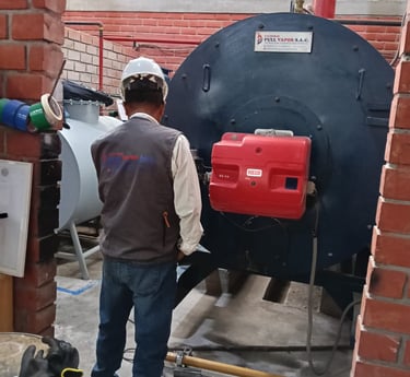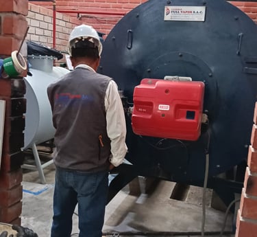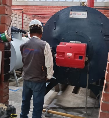 Montaje y conexión completa de sistema de vapor, pruebas de funcionamiento y calibración de quemador automático.