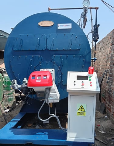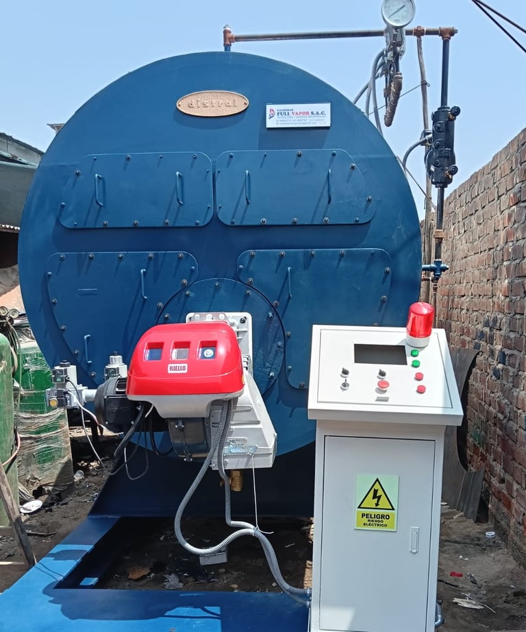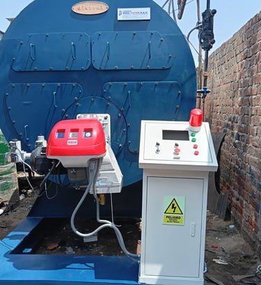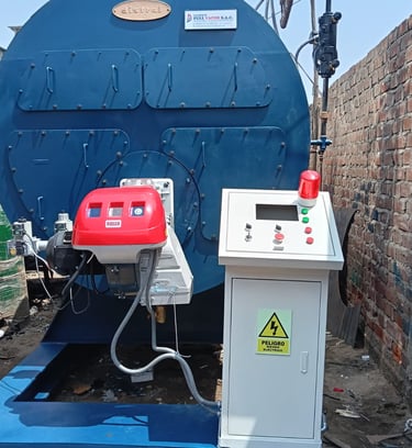 Instalación de caldera industrial con tablero de control automatizado y sistema de seguridad para operación continua.